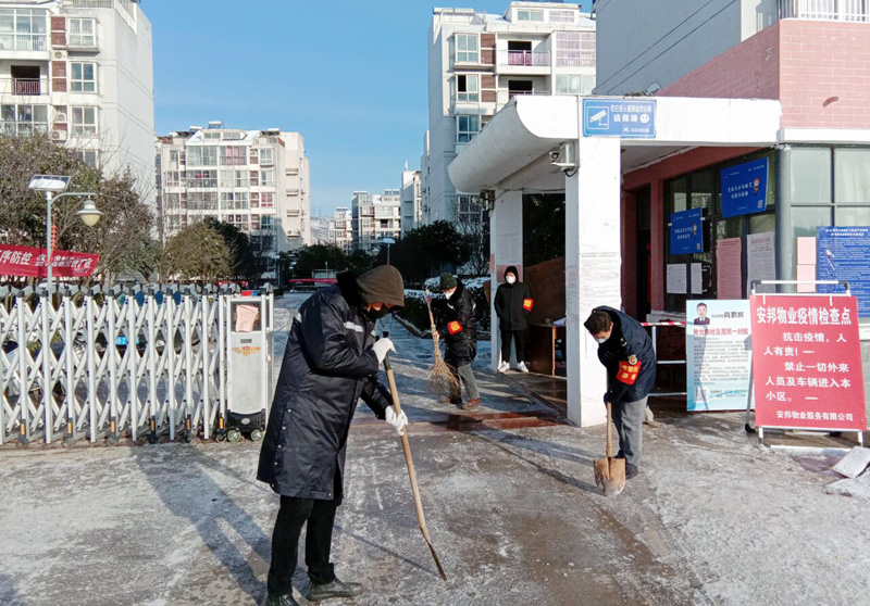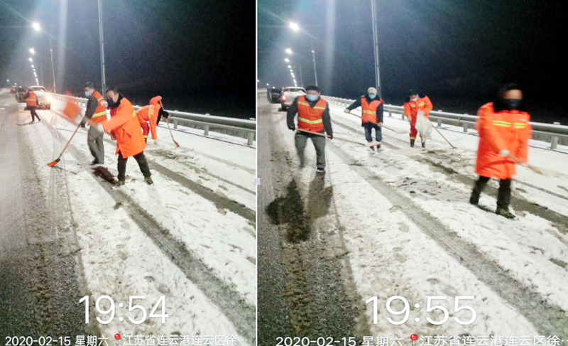 2月15日晚18:00時,徐圩悅升公司班子成員及各分公司黨政負(fù)責(zé)人全員出動,帶領(lǐng)18名突擊隊員快速趕赴新區(qū)上海路、徐圩大道、徐新路、金港路等主要交通要道,連續(xù)奮戰(zhàn)4個多小時,對橋梁、彎道等重點(diǎn)防滑路段進(jìn)行清雪防凍處理,共鋪灑融雪劑10余噸?!跋愫忧榫墶⑿腋<覉@”兩個職工小區(qū)防控疫情值守人員,不懼嚴(yán)寒,冒著大雪,在小區(qū)加強(qiáng)巡邏防控。該公司應(yīng)急大隊按照徐圩新區(qū)防疫指揮部要求,配合社區(qū)對珠江鋼管相關(guān)路道進(jìn)行封閉管控。