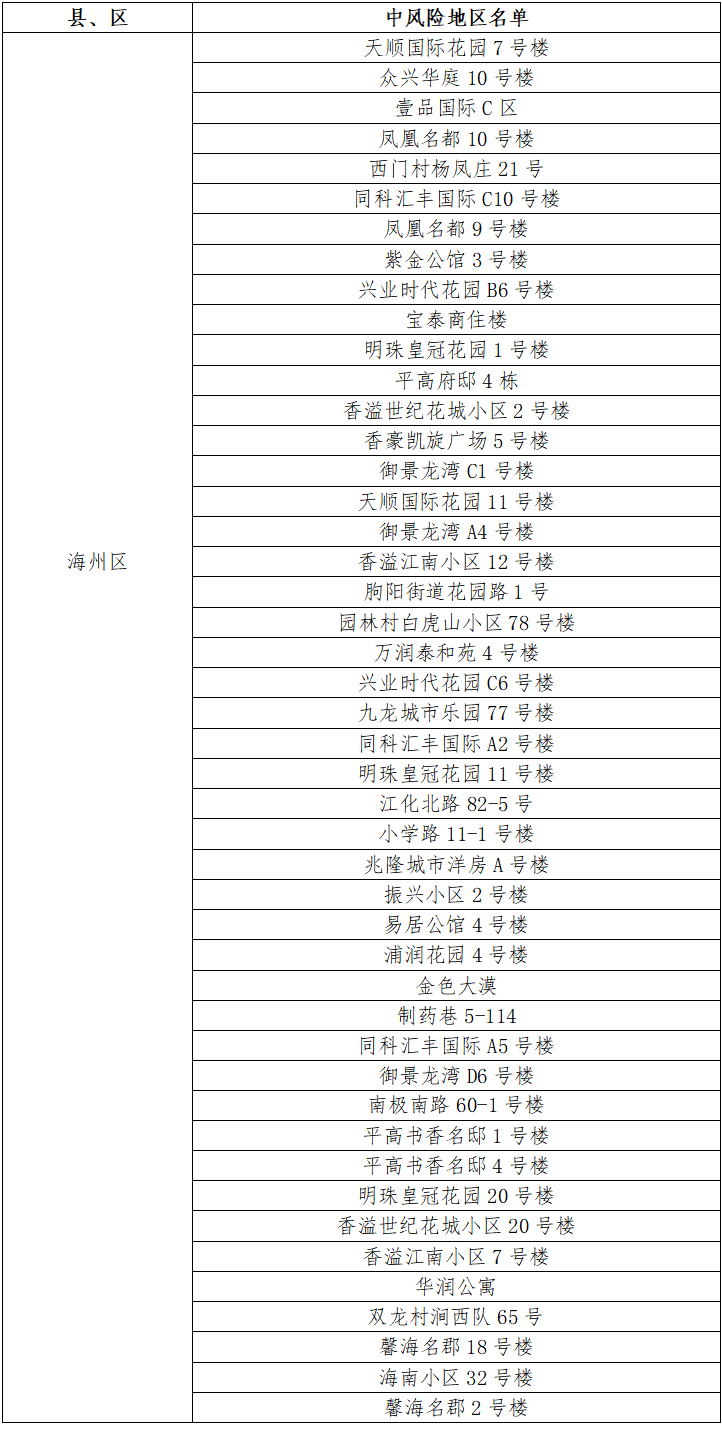 根據(jù)國務(wù)院聯(lián)防聯(lián)控機(jī)制有關(guān)規(guī)定,經(jīng)市指揮部研究決定,自發(fā)布之日起,對我市部分區(qū)域疫情風(fēng)險等級進(jìn)行調(diào)整:海州區(qū)中央華府D1棟、玉蘭國際5號樓、福園名邸3號樓、一品苑44號樓、博威江南明珠苑33號樓、如佳賓館(霞輝路店)、鳳祥銘居7號樓、蒼梧春曉23號樓、龍河小區(qū)25號樓、鷹游水岸花園5號樓、海南小區(qū)34號樓、仕方國際9號樓、茗馨花園18號樓、梧桐藍(lán)山晴園7號樓、富強(qiáng)路疏導(dǎo)點旁三合院、百達(dá)菲力酒吧、通灌南路66號3棟、極美公寓4號樓、路南街道河運路35號樓、海連中路151號、興城四號公寓8號樓、青年路55號5棟、東方領(lǐng)秀7號樓、寶翔財富廣場3號樓、園林村白虎山組王莊隊13號、津華苑小區(qū)A2號樓、盛世豪庭小區(qū)8號樓、許莊村楊圩北隊51號、振興公寓6號樓、建欣路1號樓、園林村白虎山小區(qū)100號、路南街道東村巷2號樓、建設(shè)中路76-24號由中風(fēng)險地區(qū)調(diào)整為低風(fēng)險地區(qū)。