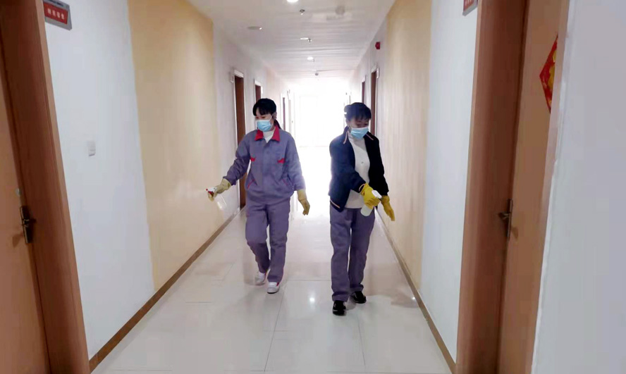 干凈整潔的辦公樓、宿舍樓里飄著淡淡的消毒水味道,清瘦干練的保潔員任禮勤正在仔細(xì)地打掃著樓道。5號(hào)疫情突發(fā)之時(shí)她正好當(dāng)班,根據(jù)以往疫情經(jīng)驗(yàn),她果斷地把一直照料著的年邁母親安排給了大哥,此后便堅(jiān)守在工作崗位上。疫情防控期間的工作量增加了不少,每天她和同事們分片作業(yè),在認(rèn)真做好各自清潔區(qū)每日兩次的保潔、消毒工作的同時(shí),還要負(fù)責(zé)就餐人員一日三餐的登記、測(cè)量體溫等工作。每天從早上7點(diǎn)開始,5位保潔員的身影便忙碌在公司的門廳、餐廳、樓道、電梯等場(chǎng)所,這一忙常常要到晚上6點(diǎn)多?!罢?qǐng)您量下體溫”“今天你做核檢了嗎”,這些溫馨的話語幾乎成了她們對(duì)大家的問候語。