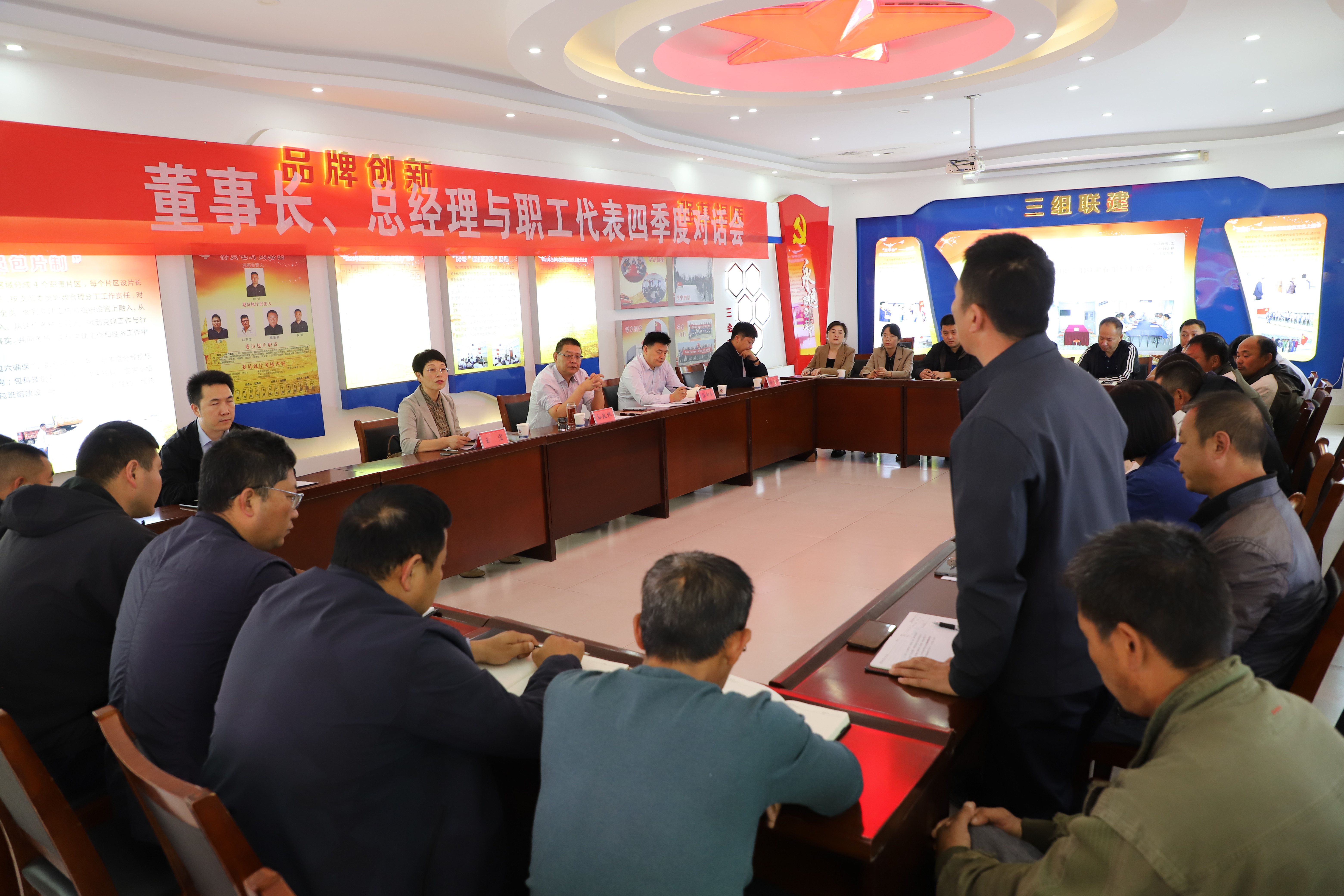 2023年10月19日下午,產(chǎn)業(yè)工人代表與公司董事長、總經(jīng)理齊聚一堂,就生產(chǎn)生活中遇到的問題提建議、獻(xiàn)良策。