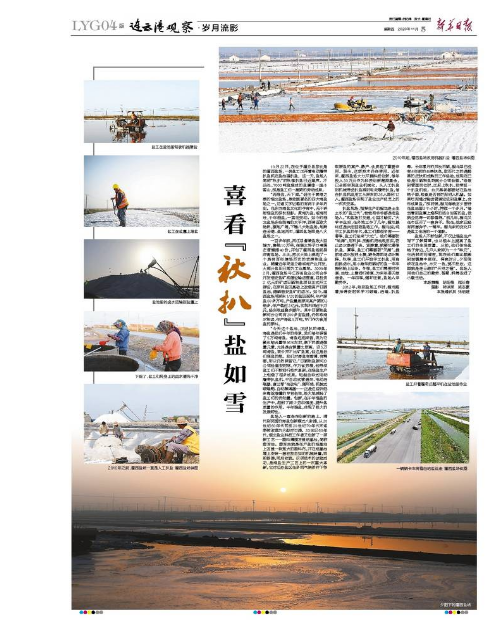 扒鹽現(xiàn)場(chǎng),指揮生產(chǎn)的程龍是土生土長(zhǎng)的“鹽三代”,爸爸和爺爺都是老鹽場(chǎng)人?!昂望}場(chǎng)打交道,心里才踏實(shí)?!贝髮W(xué)畢業(yè)后,在外地工作了幾年,程龍最終還是決定回到鹽場(chǎng)工作。程龍說(shuō),純手工扒鹽的年代,鹽工們都很辛苦——春季,鹽工們迎來(lái)“大忙”。他們需要防“地漏”,用石拱、壓割機(jī)把池底壓實(shí),防止鹵水滲透下去。緊接著,就要忙春季扒鹽。夏季,鹽工們需要防“天漏”,提前將鹵水放進(jìn)土塘,避免降雨將鹵水稀釋。秋季,鹽工們開(kāi)始手工扒鹽,用扁擔(dān)挑鹵水,用小推車(chē)把曬好的鹽一車(chē)車(chē)推到船上運(yùn)走。冬季,鹽工們需要對(duì)溝道、池埝、土塘進(jìn)行修復(fù),為來(lái)年春天做準(zhǔn)備。一年四季,循環(huán)往復(fù),鹽場(chǎng)人辛勤勞作。