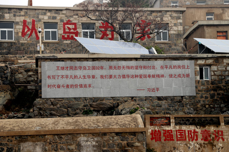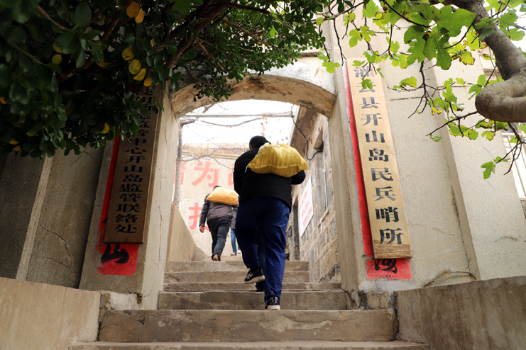 上午8點,在發(fā)動機巨大的轟鳴聲中,漁船緩緩駛離港口。近一個小時的顛簸,開山島出現(xiàn)在了視野里,由小到大,逐漸清晰。簡易碼頭上,守島民兵遠遠地沖著大家揮手,船上的人顧不上漁船的劇烈晃動,一個個扒著船沿?zé)崆榛貞?yīng)著,所有人的臉上都寫滿敬意和期待。漁船隨著海浪的節(jié)拍上下晃動著,班組長們登上碼頭,就緊緊握住守島民兵的手,對他們守島衛(wèi)國,無怨無悔堅守和付出的愛國奉獻精神表示欽佩。班組長們跟隨著守島民兵沿著王繼才夫婦他們當(dāng)年的巡邏路線,拾級而上,大家一邊感受巡島爬山的辛苦,一邊聆聽著守島民兵講解王繼才夫婦32年守島的艱難困苦和生離死別。
