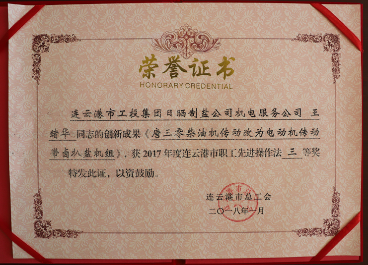 近日,日曬制鹽新河制鹽分公司安樹林同志的創(chuàng)新成果《輕型自吸式電動(dòng)履帶扒鹽機(jī)》,被市總工會(huì)評(píng)為2017年度連云港市職工先進(jìn)操作法二等獎(jiǎng),日曬制鹽公司機(jī)電服務(wù)公司王緒華同志的創(chuàng)新成果《唐三零柴油機(jī)傳動(dòng)改為電動(dòng)機(jī)傳動(dòng)帶鹵扒鹽機(jī)組》,被市總工會(huì)評(píng)為2017年度連云港市職工先進(jìn)操作法三等獎(jiǎng)。(西工)
