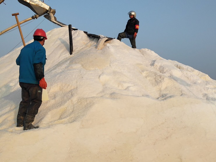 3月3日,日曬制鹽埒南分公司5臺扒鹽機(jī)組全面響機(jī)收鹽,白色鹽田安全警示彩旗飄飄,破碴機(jī)穿梭往來,一片繁忙景象,收鹽機(jī)好似一條貪吃蛇,在鹽池里緩緩收鹽,大廩里一條白練傾瀉而下,堆砌成一座座銀山。