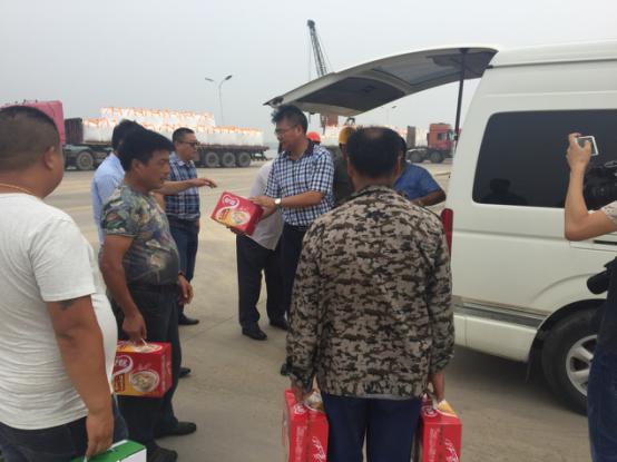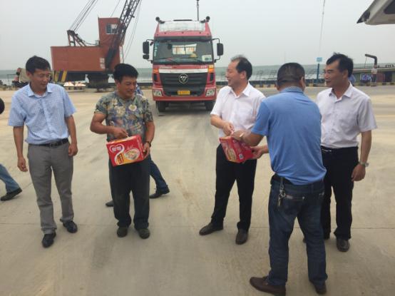 2017年7月18日星期二下午灌西鹽場(chǎng)投資公司領(lǐng)導(dǎo)到宵洋物流有限公司碼頭送清涼看望一線員工!在黨委書(shū)記董事長(zhǎng)王德志同志、總經(jīng)理李國(guó)文同志、工會(huì)主席王保平同志的帶領(lǐng)下親自到我宵洋物流有限公司碼頭看望一線員工,送清涼。炎炎夏日,酷暑當(dāng)頭一線員工永遠(yuǎn)沖鋒在前,領(lǐng)導(dǎo)的關(guān)懷更是永不停止!宵洋物流全體員工致謝?。ㄏ笸跞唬?br />