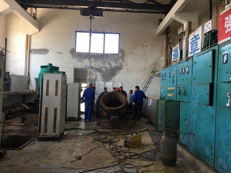 近日高溫高蒸發(fā),全場海水養(yǎng)殖區(qū)海水需求量變大,養(yǎng)殖池塘水位連續(xù)告急,另六圩閘閘站五號機泵的水葉老化,出水量變小,導(dǎo)致工作效率降低,不能滿足日常的工作要求。于是副經(jīng)理孫曉波帶領(lǐng)資源管理公司人員配合生產(chǎn)部機修人員對六圩閘機泵進行搶修,為了趕在潮水之前爭取把水葉搶修好,大家擼起袖子加油干,有人開行車、有人拿撬棒、有人拿大錘、有人拿特制大扳手、有人拿電焊槍等,大家齊心協(xié)力各有分工,終于完成吊泵和水葉拆卸、安裝等,現(xiàn)場出現(xiàn)一片繁忙的景象。為能夠早日修好機泵,保證正常供水,十余人起早貪黑在六圩閘站的大機房努力搶修著。