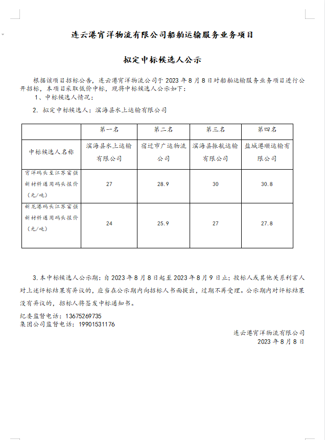 連云港宵洋物流有限公司船舶運輸服務業(yè)務項目擬定中標候選人公示