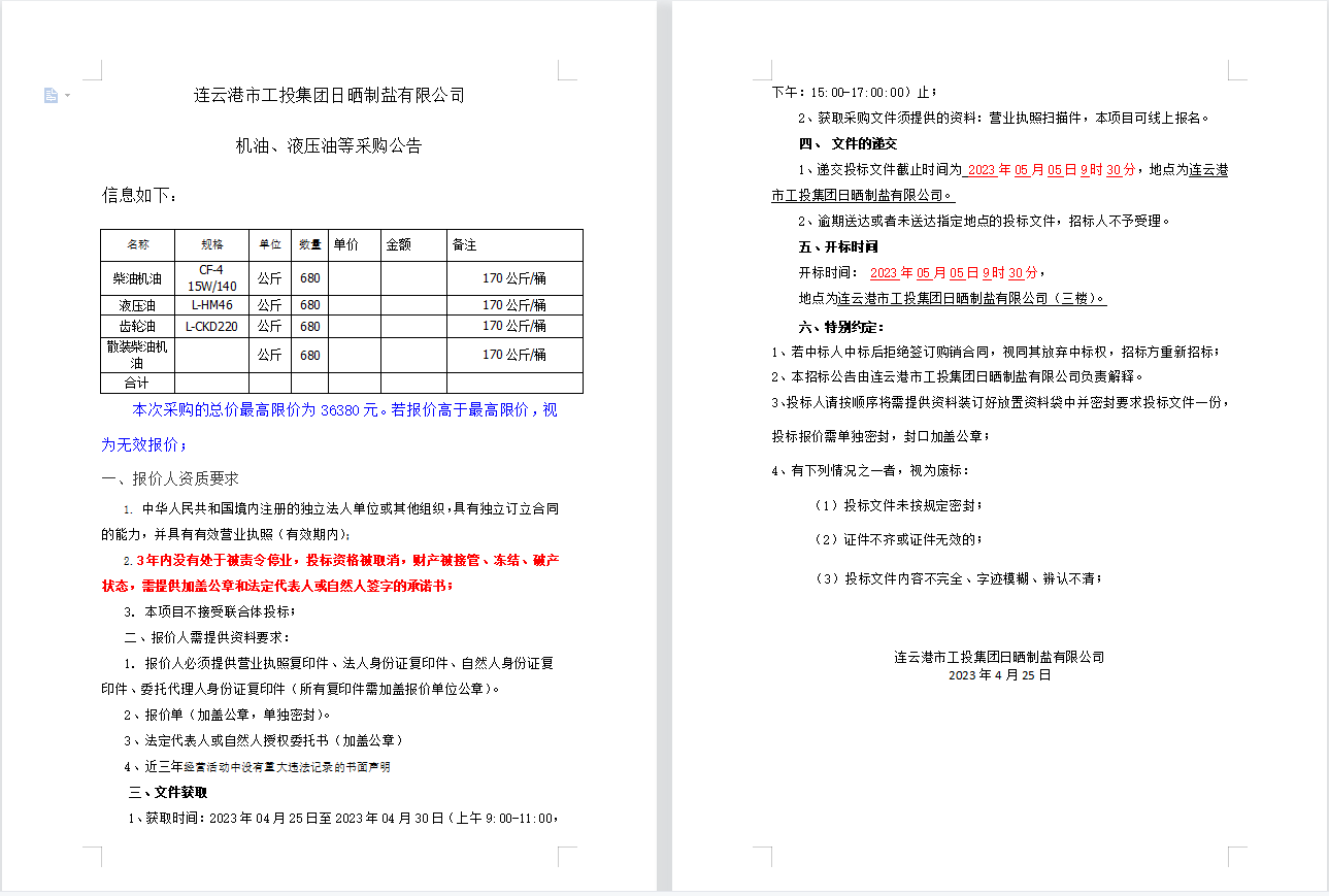 連云港市工投集團(tuán)日曬制鹽有限公司 機(jī)油、液壓油等采購公告