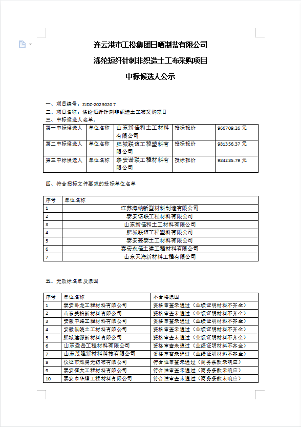 連云港市工投集團日曬制鹽有限公司滌綸短纖針刺非織造土工布采購項目中標(biāo)候選人公示