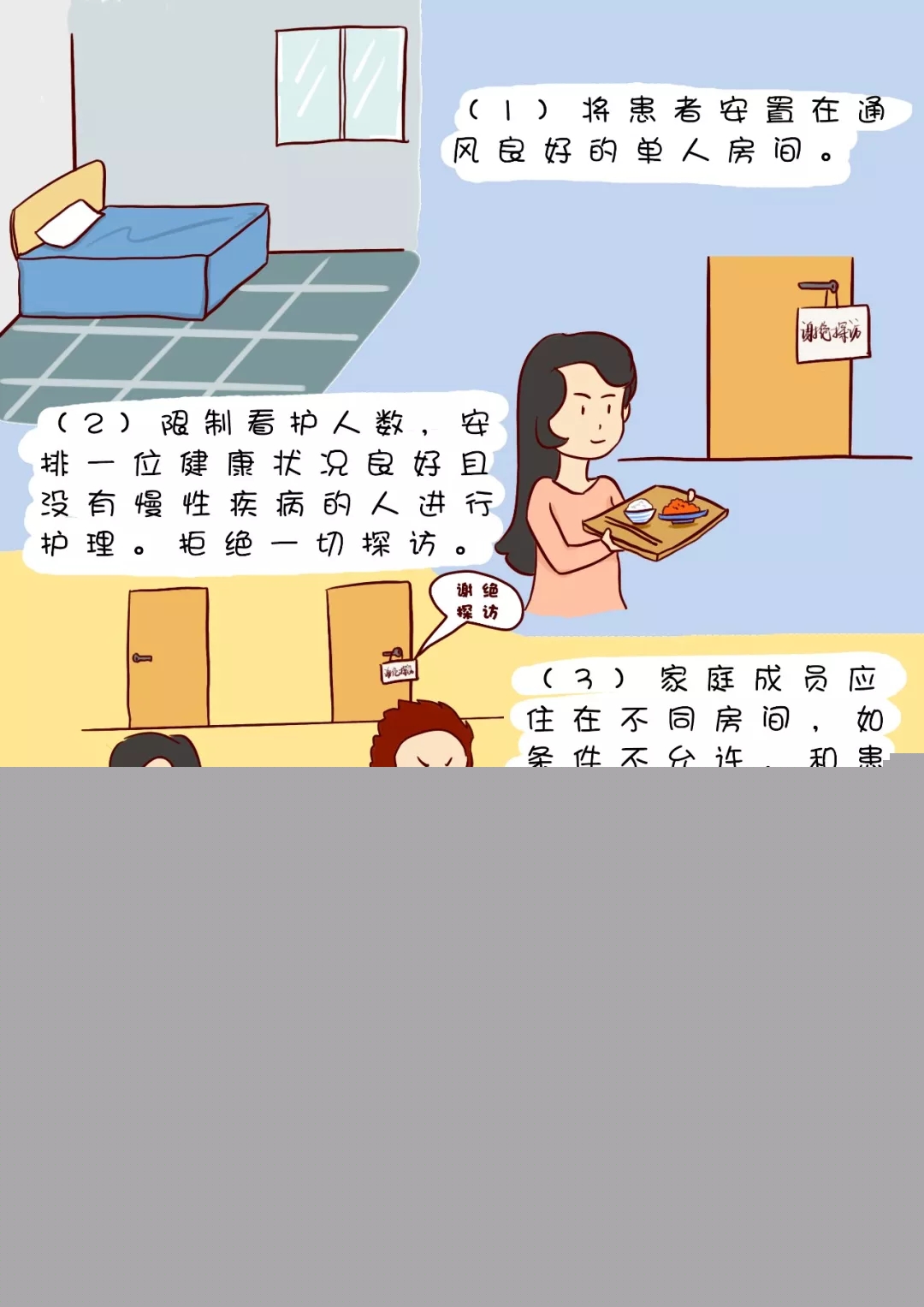 (3)家庭成員應(yīng)住在不同房間,如條件不允許,和患者至少保持1米距離。