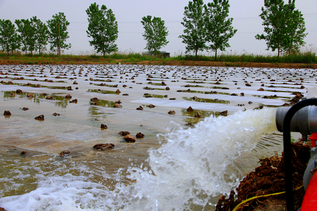 ▲塑盤育秧后進(jìn)入秧苗管理期,條田管理工正引水灌溉,全力做好保苗護(hù)苗工作,為下一步序時(shí)推進(jìn)插秧工作打下基礎(chǔ)。