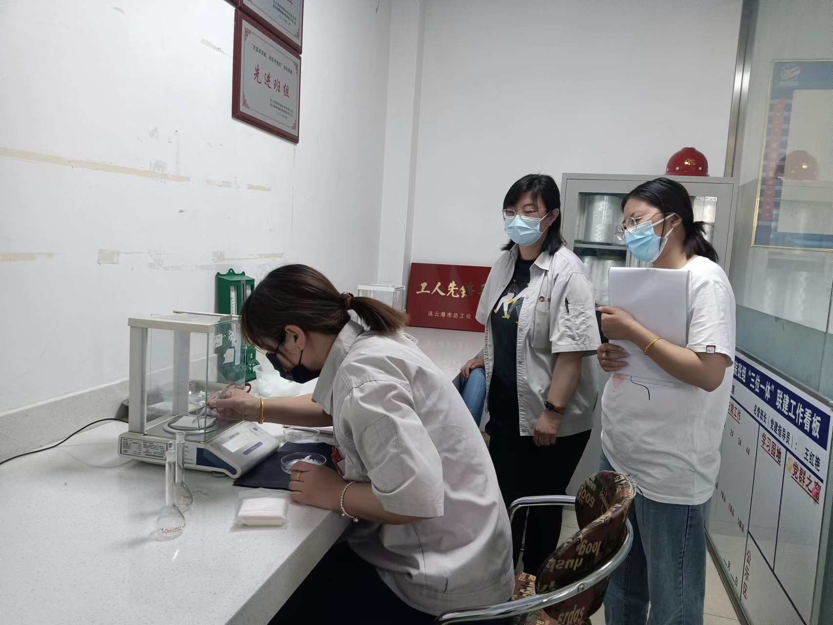 5月26日上午9點(diǎn),化驗(yàn)班組準(zhǔn)時開始比賽,選手們聚精會神的調(diào)整天平水平、置零、稱量蠟紙、置零、再稱量凍膠絲、放入容量瓶,一套操作如行云流水般一氣呵成。最終,吳珊珊同志在非常接近的比分中以2分53秒86險(xiǎn)勝!