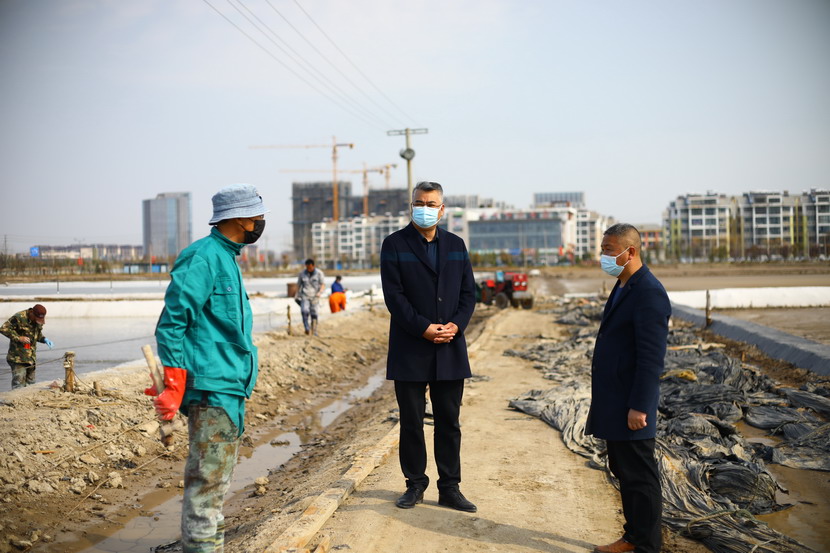 第一站來到海州灣公司昌圩班組。該班組4月1日礦鹵灌池,目前第四塊結(jié)晶池正在進(jìn)鹵,該公司三大組長帶著各自隊(duì)伍都來支援,一起給新灌結(jié)晶池更換新塑苫布,大家忙的不亦樂乎。王董事長首先慰問大家,新冠疫情暴發(fā)以來,海州灣公司廣大員工克服困難,一邊強(qiáng)化疫情防控,一邊加班加點(diǎn)抓生產(chǎn),雖然有的工作耽誤了,但是礦鹵灌池工作仍然趕在天時轉(zhuǎn)好之前進(jìn)行了。昨天進(jìn)鹵的結(jié)晶池底已經(jīng)鋪上了一層鹽,看起來甚是喜人。昌圩班組負(fù)責(zé)人,老先進(jìn)老黨員朱春年同志看到王董事長來檢查工作,他也非常高興,和海州灣公司負(fù)責(zé)人劉天義一同聚攏過來,與董事長攀談,匯報工作。最后王董事長強(qiáng)調(diào),一定要抓緊灌池,抓緊更換新塑苫布,打好“礦鹵復(fù)產(chǎn)”戰(zhàn),我們基礎(chǔ)產(chǎn)業(yè)牢固了,臺北的發(fā)展也就穩(wěn)固了。同時,也不要忘記抓好疫情防控工作,職工集體工作時要保持一米線距離,保證不扎堆。劉天義、朱春年代表職工表態(tài),一定按照投資公司有關(guān)布置抓好各方面工作,一定拼命干,加油干,爭當(dāng)虎將打頭陣,當(dāng)好“臺北保衛(wèi)戰(zhàn)”主攻隊(duì)。