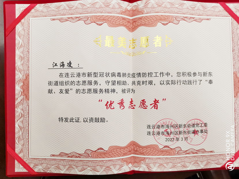 近日,港城成功戰(zhàn)勝新冠肺炎疫情,全市“摘星”轉(zhuǎn)為低風險地區(qū)。疫情發(fā)生以來一直奮戰(zhàn)在社區(qū)抗疫一線的黨員也收獲一份喜悅,紛紛被所服務(wù)街道、社區(qū)評為“最美志愿者”等榮譽稱號,江海凌就是其中優(yōu)秀代表之一。
