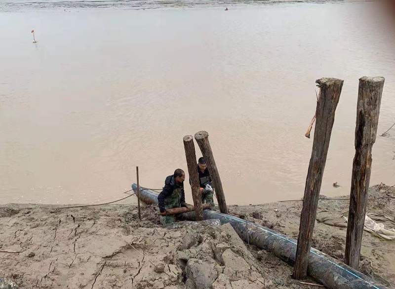 ?一想到昨天管道巡查到這里的情形,現(xiàn)在還讓人“心有余悸”!因管道地處善后河彎道處,常年的泄洪沖刮將河邊覆蓋管道的泥土沖刷卷走,使得岸邊泥土下原本穿越的PE315管道已經暴露出來,退潮時的旋流不斷地沖撞著漂浮起來的鈣液管道,劇烈抖動著的管道不時發(fā)出“噗噗的低吼”隨時可能折斷。埒子口潮河段是鈣液東輸灌西管道最長的一節(jié)過河穿越,全長約300米。穿越管道如果折斷在河底后果將不可想象、經濟損失也是不可估量的,這一幕讓在場所有人員都為之捏了一把汗!