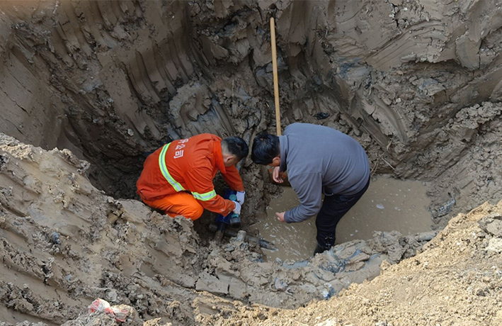 11時,已查明管道漏點處系PE63管道斷裂,至于管道斷裂的原因,判斷是地面沉降使管道落差錯位所致。搶修人員站在2米多深的泥坑里,不怕臟和累,徒手加緊管道搶修。經(jīng)2個多小時緊張有序搶修,成功將斷裂的水管修好。于當日下午16時30分恢復(fù)供水,有力保證了轄區(qū)春季綠化澆灌工作正常開展。(王宜全、楊維軍)