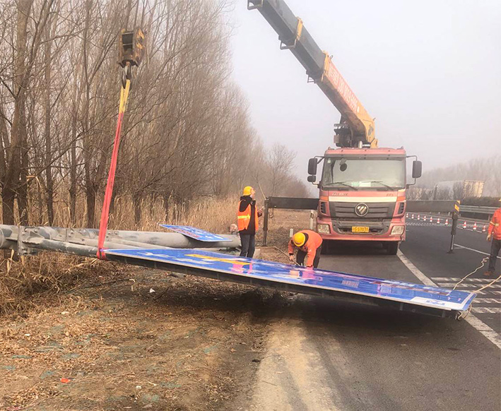 1月12上午,市政道路養(yǎng)護人員在巡查中發(fā)現(xiàn),S242交叉路口北側交通標示牌存在重大交通安全風險,經查看,發(fā)現(xiàn)標志牌基座螺栓已斷三根。該公司立即組織維修人員到達拆除現(xiàn)場,工作人員在標志牌四周擺放警示標志,設置安全作業(yè)區(qū),一名隊員則擔當起臨時交警,引導過往車輛有序通行。因標志牌較大,先期利用機械先將其固定住,隨后工作人員對基座和標志牌進行拆除分解,整個過程分工明確,準備充分,經過近2個小時的緊張施工,迅速完成拆除工作。10時許,工作人員并對附近另一塊大型交通標志牌進行扶正并進行加固。此次拆除行動共出動隨車吊機一臺、登高車一臺、工作人員8人次,安全拆除標志牌一塊,扶正、加固標志牌一塊,確保了交通暢通和行車安全。